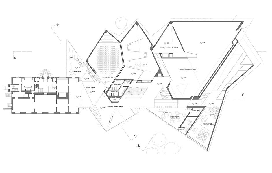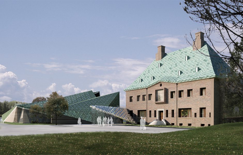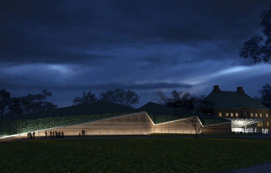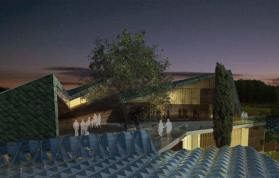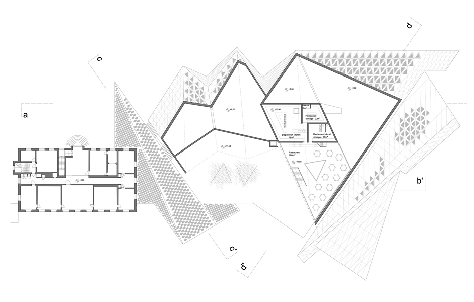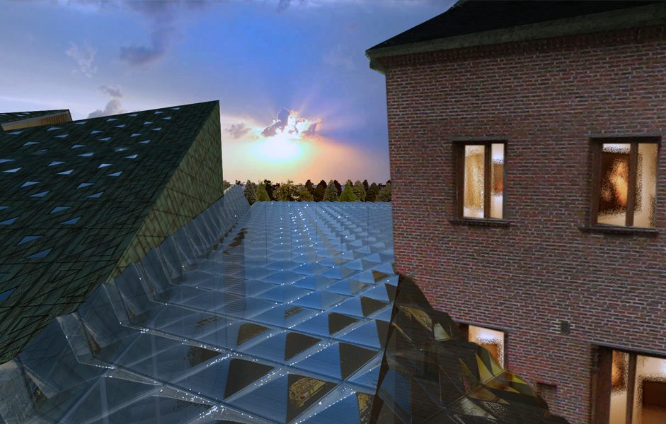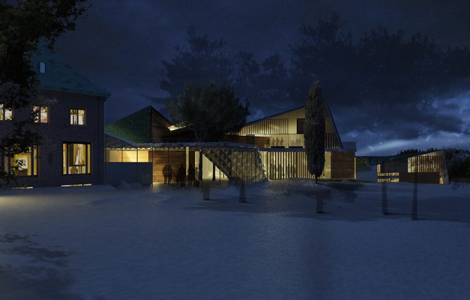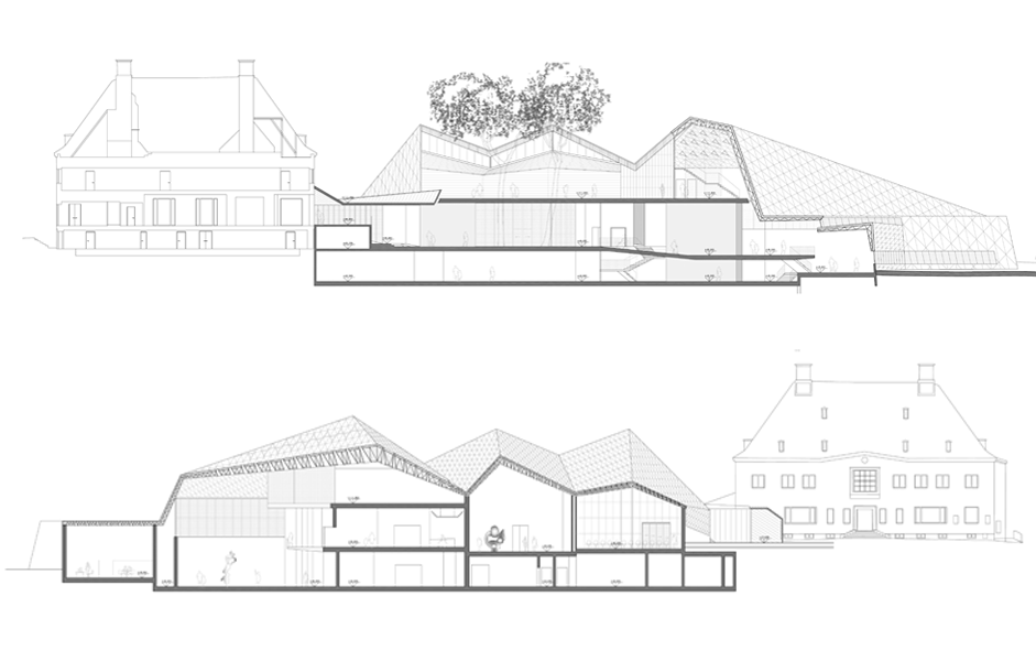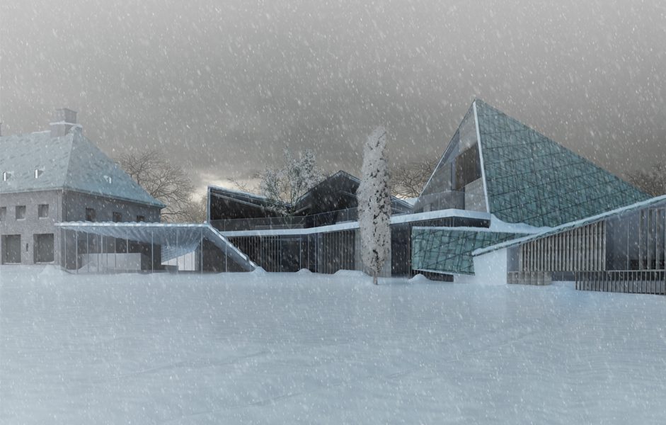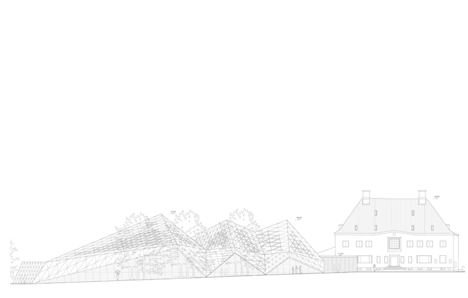 La forma frastagliata dei nuovi volumi affonda le sue radici nelle caratteristiche del luogo, di fatti l’inclinazione delle falde è la diretta conseguenza alla mediazione tra le linee orizzontali che caratterizzano il paesaggio, quelle verticali corrispondenti agli alberi ed infine quelle inclinate alle falde dei tetti. L’obiettivo infatti è creare una prosecuzione delle linee del tetto del maniero fino a raccordarlo con il terreno.