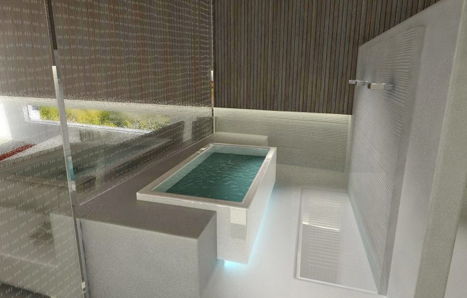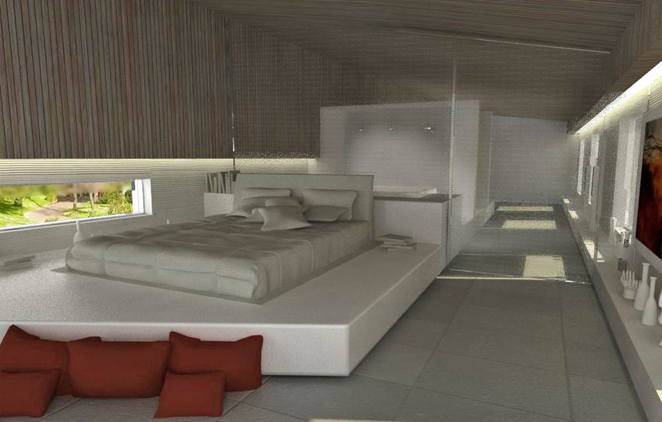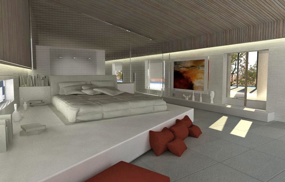 La stanza da letto, intima e minimalista, si pone in contrasto con l’esuberanza della zona giorno per la sua estrema sobrietà; strutturata come un open space dove una vetrata separa la vasca idromassaggio dal letto, ospita anche una stanza armadio e i servizi igienici.
