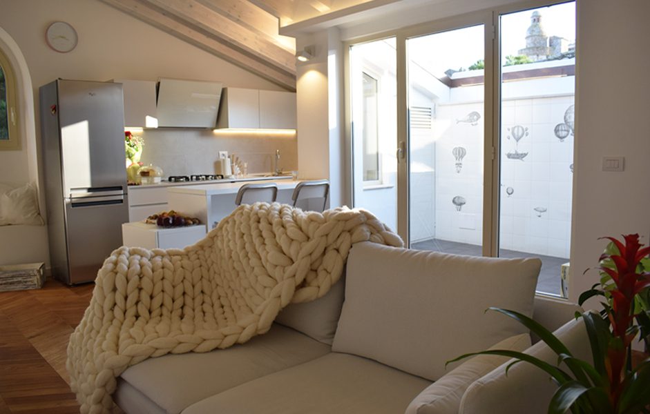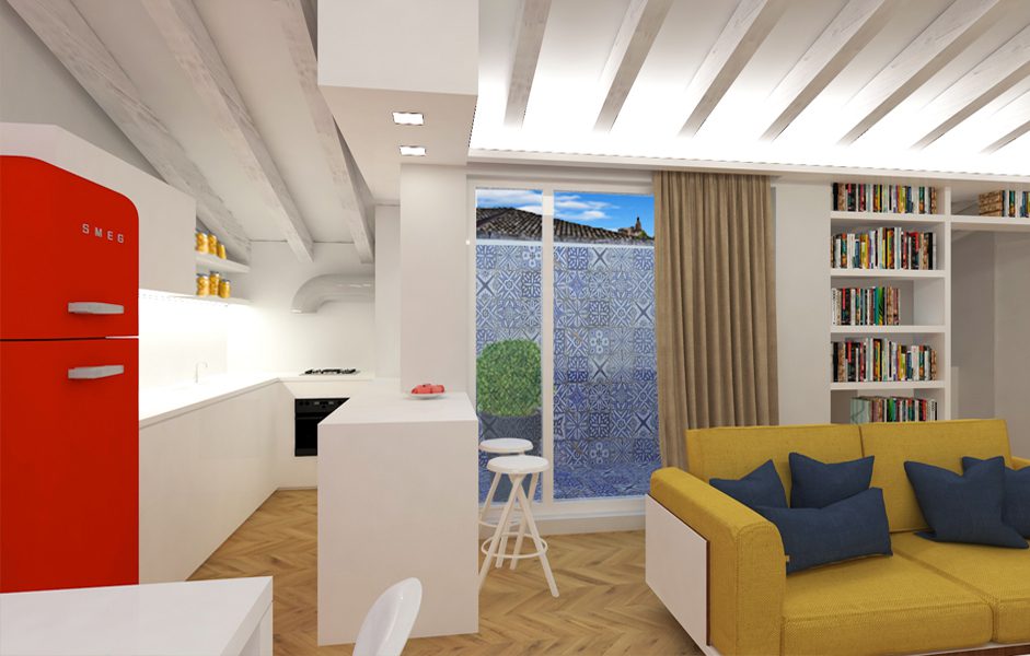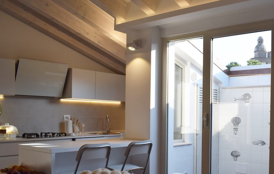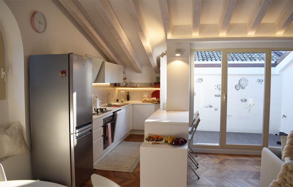 La zona giorno è caratterizzata dalla presenza di un piccolo terrazzino “a tasca” ricavato all’interno della falda di copertura attorno al quale sono situati gli spazi principali: cucina – pranzo, soggiorno e piccolo studio.