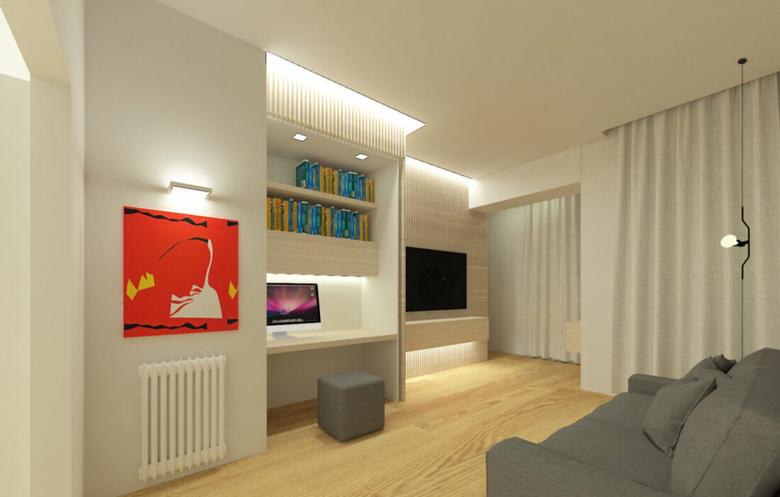 Nel salotto, un piccolo studio è stato ubicato in una nicchia a scomparsa, nascosta da una pannellatura con lo stesso rivestimento del muro. L’illuminazione in led a parete, abbinata a faretti e lampade offrono diverse ambientazioni illuminotecniche.