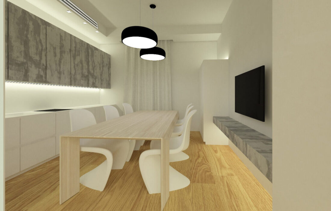 Separata dal soggiorno da una porta in vetro, la cucina funge anche da sala pranzo e spazio di convivenza, con gli elettrodomestici nascosti nelle colonne armadi. I pensili superiori hanno una finitura simile al cemento che è anche ripresa dal console sotto la TV, donando un carattere contemporaneo ed elegante all’ambiente.