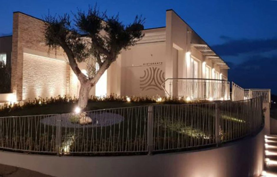 L’edificio principale ospita un ristorante caratterizzato da un’architettura dalla forte impronta mediterranea rivisitata in chiave moderna, realizzata attraverso l’impiego di materiali naturali e tradizionali, con l’obiettivo di un inserimento armonico nel contesto naturale circostante, occupa una posizione privilegiata all’interno del complesso turistico ricettivo.