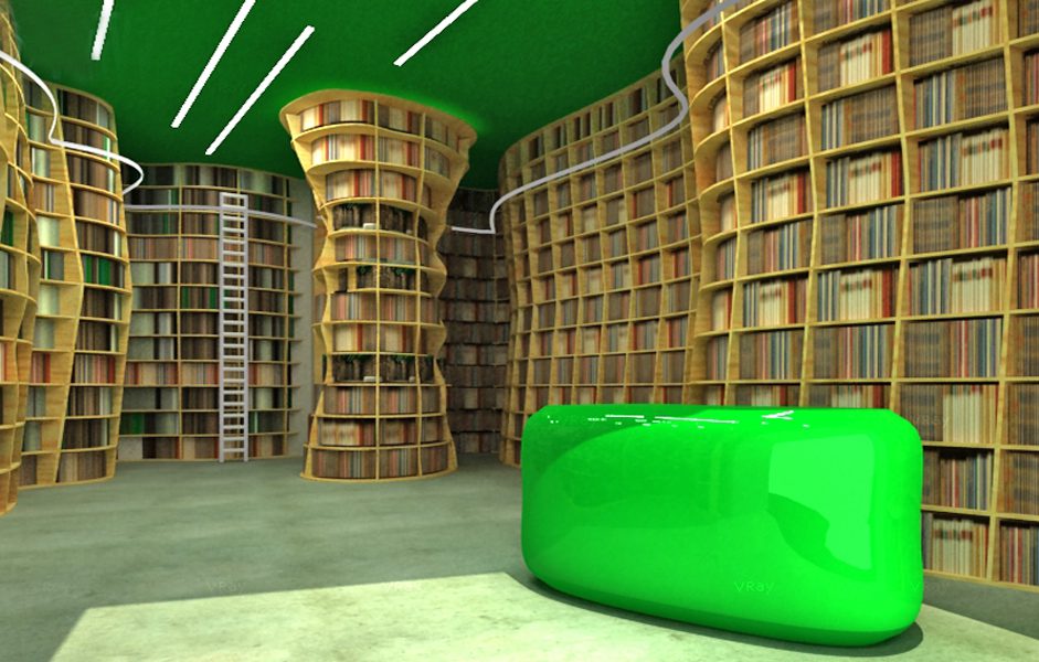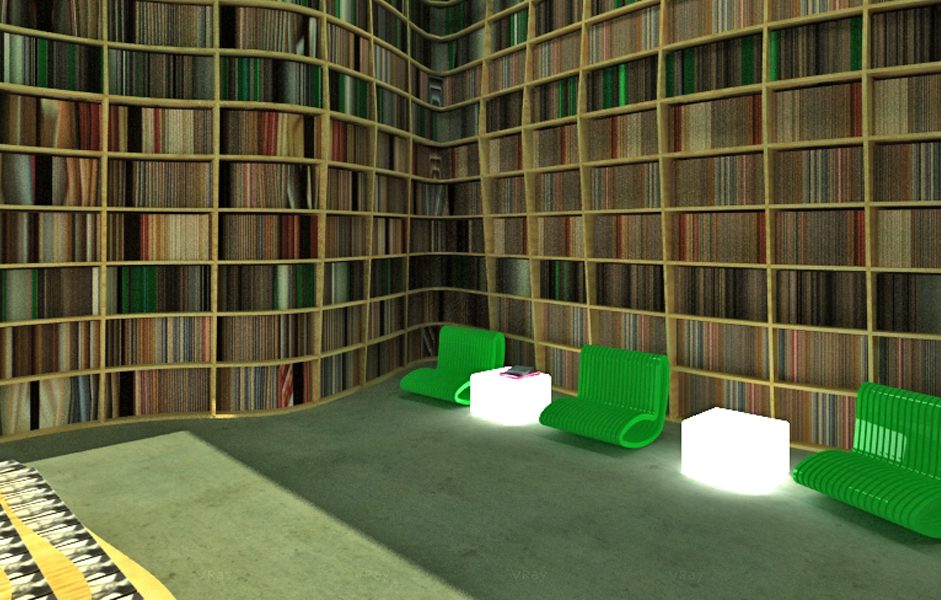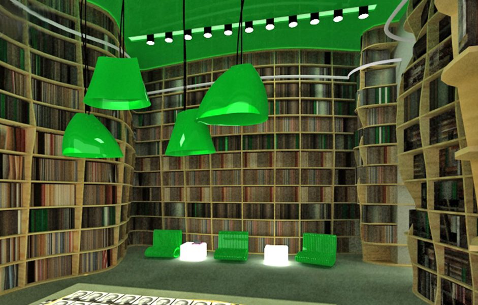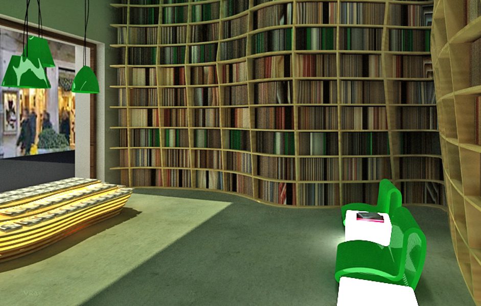 Lo spazio commerciale è caratterizzato dalla presenza di una grande libreria a tutta altezza dalle forme sinuose che si articola lungo tutto il perimetro del locale. Costruita grazie a tavole di legno multistrato tagliate mediante macchina a controllo numerico. Il legno è lasciato grezzo cosi come il pavimento realizzato con cemento industriale lasciato a vista.