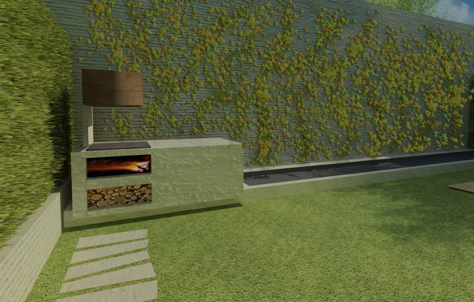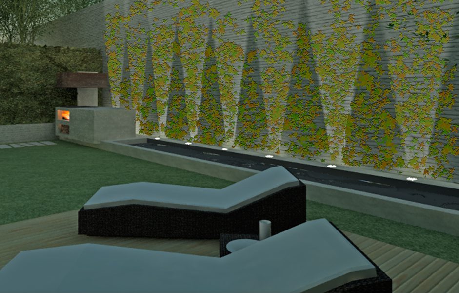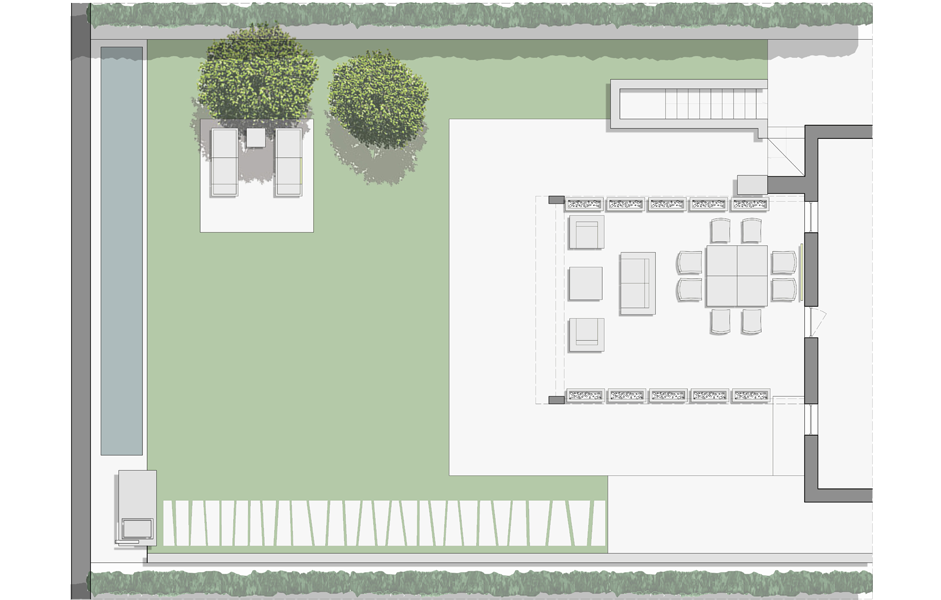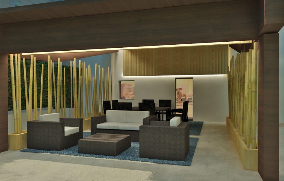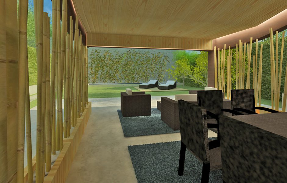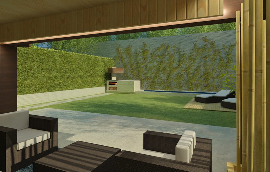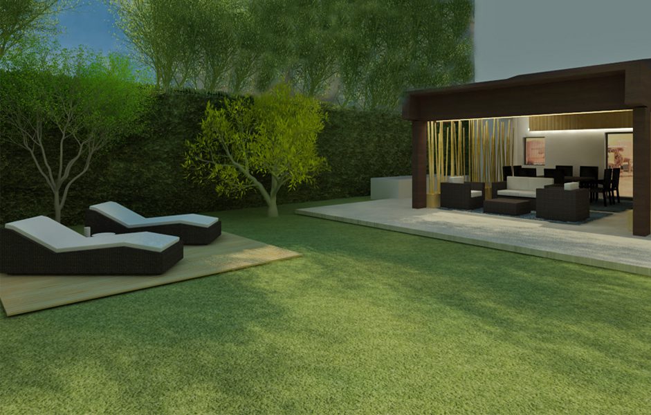 Il progetto ha come scopo quello di offrire un’immagine accogliente e moderna di un giardino esistente, cercando di preservare la maggior parte delle piante presenti. Articolato in due zone fondamentali: quella sotto la tettoia in legno lamellare, destinata al ricevimento di ospiti ed al relax dei proprietari, e la zona con lo specchio d’acqua che fa da fondale al piccolo giardino urbano. La realizzazione è contraddistinta dall’impiego di materiali naturali ed ecocompatibili come la pietra per le pavimentazioni e il barbecue (con il piano di cottura in pietra lavica); il legno (per le controsoffittature necessarie a nascondere i corpi illuminanti e dei congegni repellenti per insetti); il bamboo posto ai lati della zona arredata con funzione di schermatura. L’arredo proposto è formato da mobili in rattan con tappezzerie per esterni.