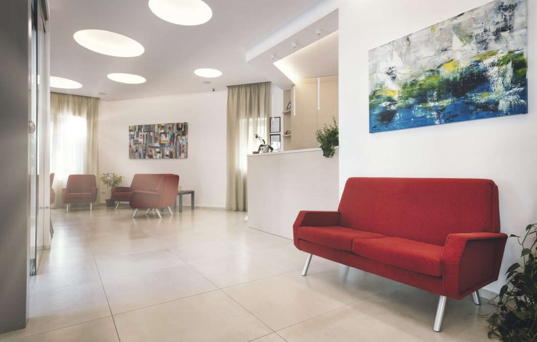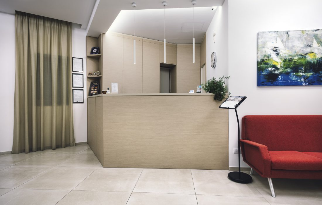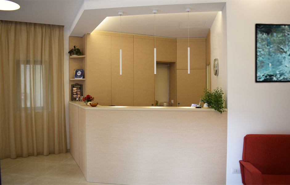 La realizzazione di nuovi mobili di falegnameria progettati su misura, pensati per ospitare tutte le funzioni necessarie, ha consentito di ridurre al minimo lo spazio reception che è dotato anche di un bar a scomparsa.