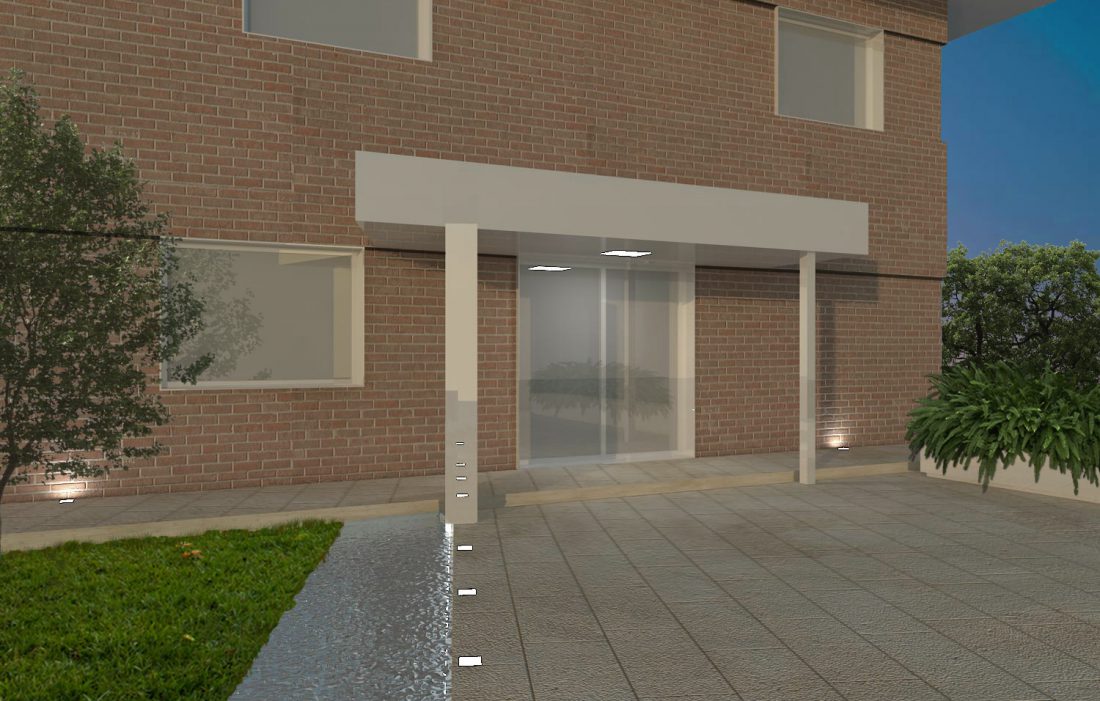 L’austerità delle facciate è caratterizzata da leggere fasce incassate ove trovano spazio gli imbotti metallici degli infissi posizionati in maniera asimmetrica.