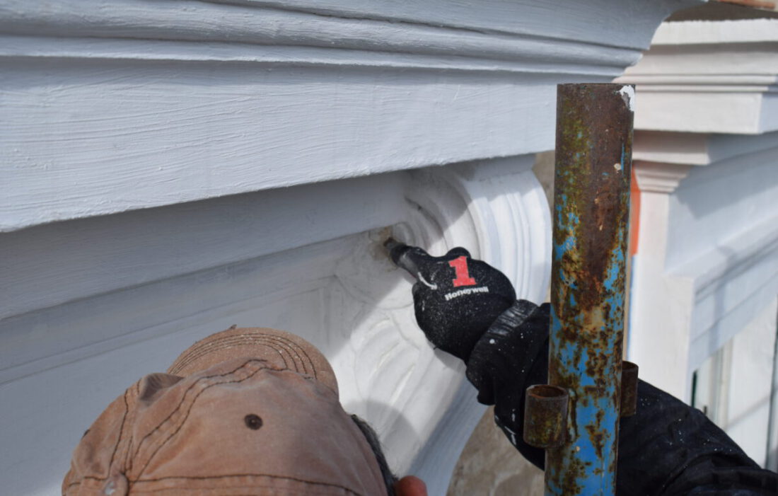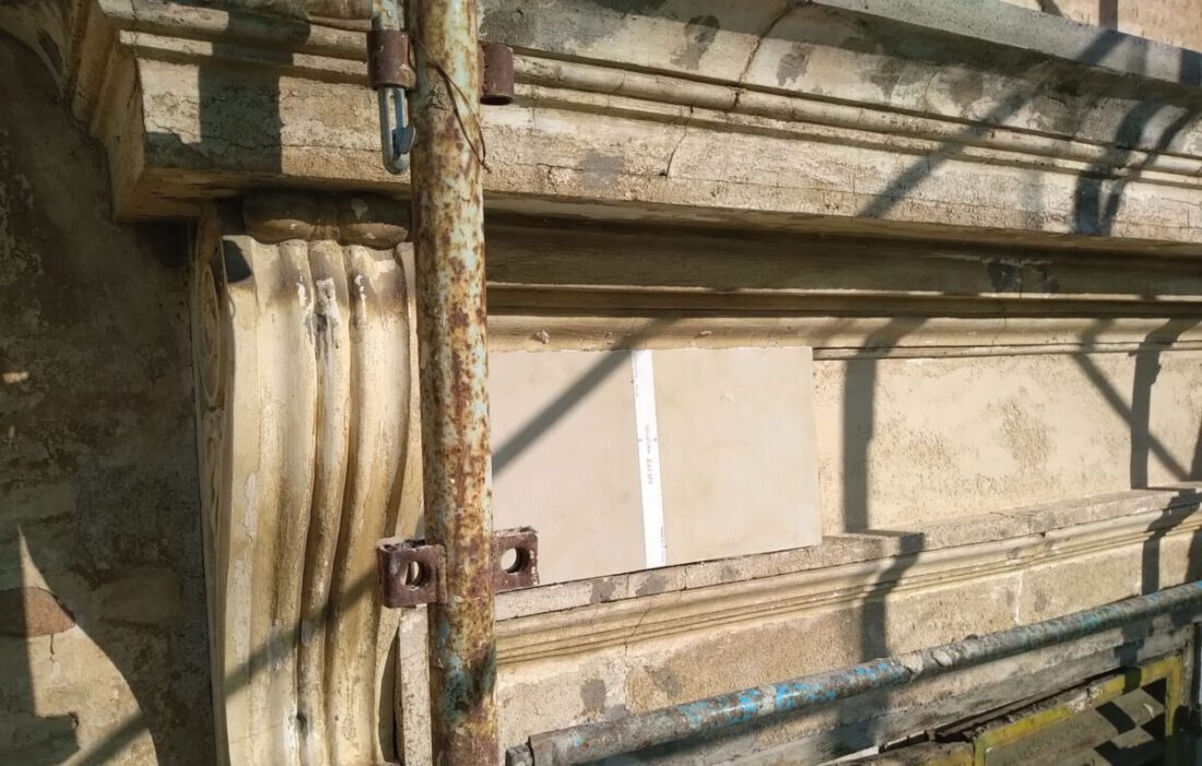 Opera di restauro delle cornici della facciata del palazzo ottocentesco con vincolo monumentale adiacente al Castello Caldoresco, nel centro storico di Vasto.