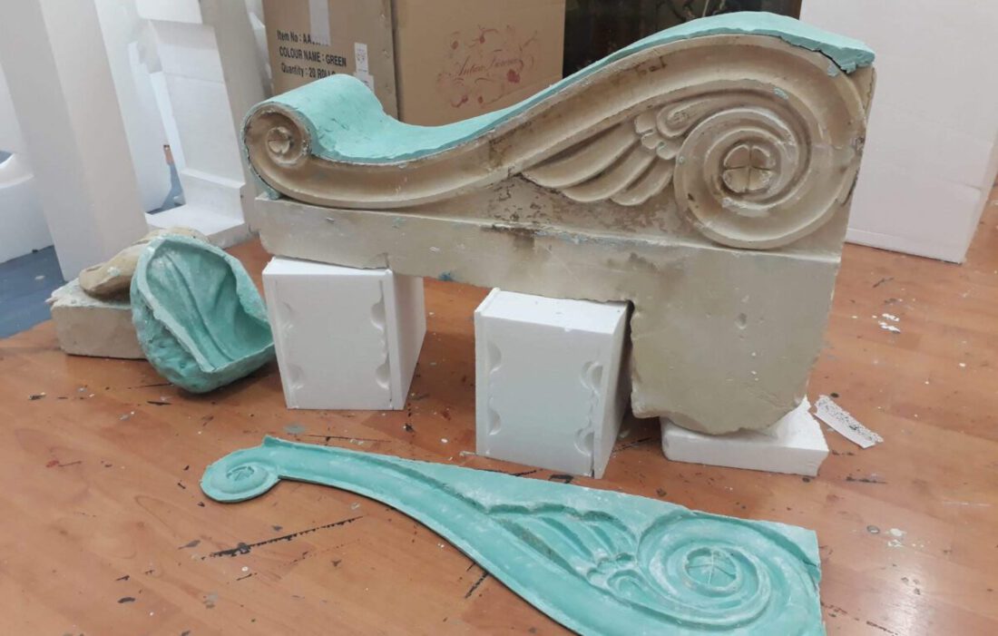 L’intervento ha interessato l’apparato decorativo delle cornici originali realizzate in concrezione a base calce ed inerti, attraverso la rimozione degli strati degradati e la ricostruzione delle lacune. Le operazioni sono state svolte attraverso apposite malte a ritiro controllato compatibili con i materiali esistenti, posate in opera attraverso l’ausilio di calchi ricavati dalle modanature in loco.
