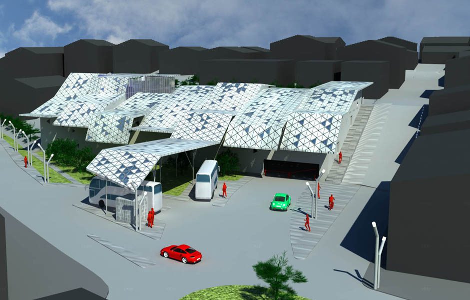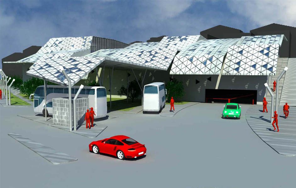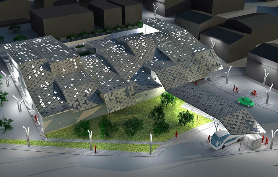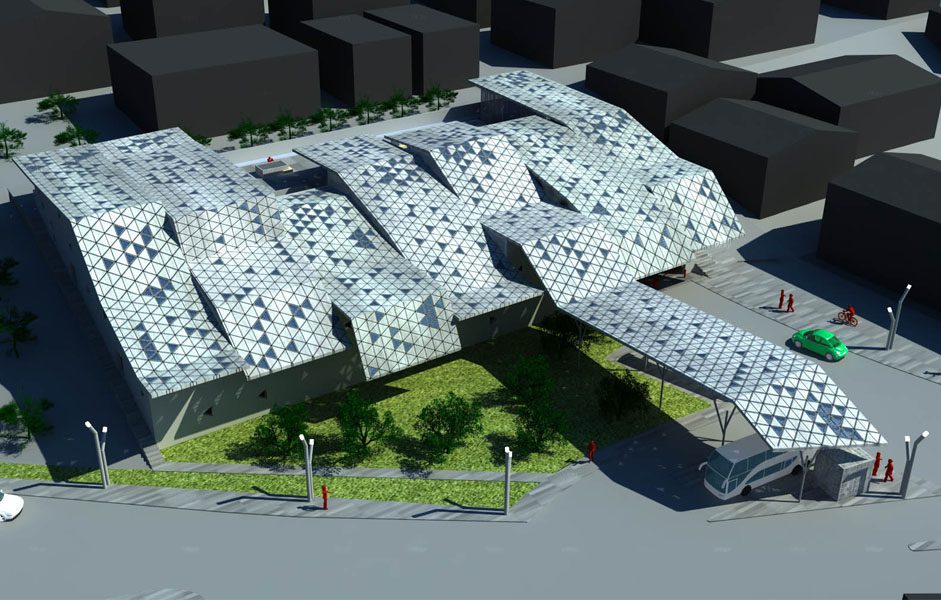 Aspetto fondamentale del progetto è la realizzazione di una copertura composta da sette fasce formate ognuna da diverse falde con inclinazioni differenti. Dette falde sono composte da struttura in acciaio con rivestimento di tegole triangolari di metallo nobile alternate a lastre triangolari di vetro con fotocellule solari integrate per la produzione di corrente elettrica.