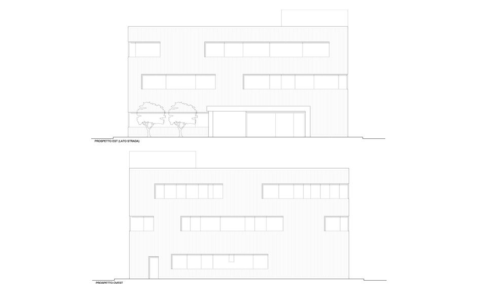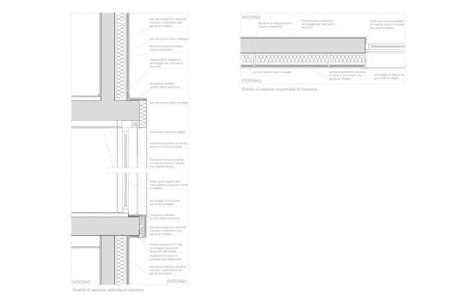 Il rivestimento è caratterizzato da un andamento ondulato intervallato da tratti di metallo piano inserito nei nastri che ospitano le aperture, quest’ultime risultano essere poste in sottosquadro rispetto al piano di facciata.