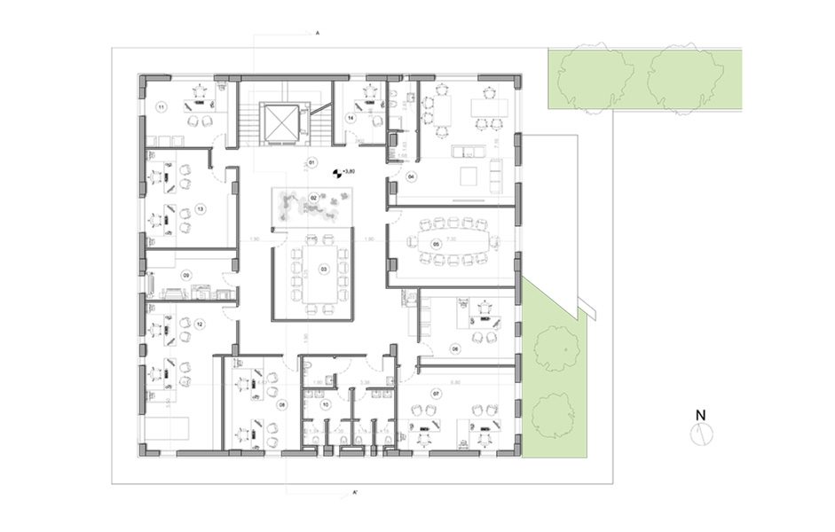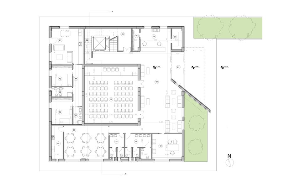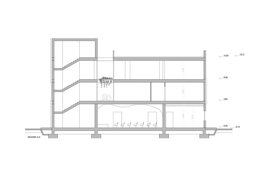 Al pian terreno sono poste diverse funzioni di rappresentanza; da un ampio foyer si accede direttamente alla sala conferenze, mentre sempre sullo stesso livello sono posti un punto di accoglienza, una sala per rinfreschi (utilizzabile anche dai dipendenti) e i servizi igienici.