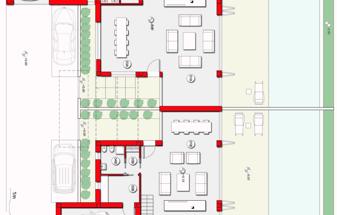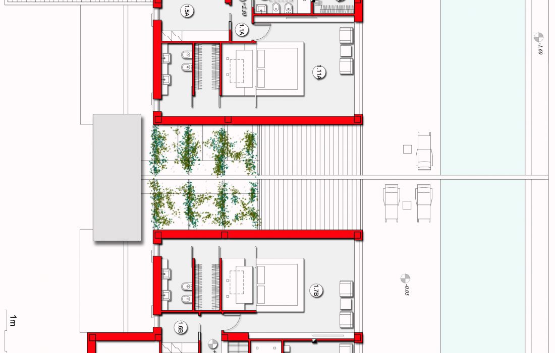Sono caratterizzati da finiture moderne sia internamente che esternamente, nonostante l’impiego del laterizio facciavista per le facciate e dei coppi per il manto di copertura. Di fatti l’aspetto esterno è stato concepito relazionandosi al contesto circostante (zona A di P.R.G. – centro storico), realizzando comunque due edifici dalle forme moderne.